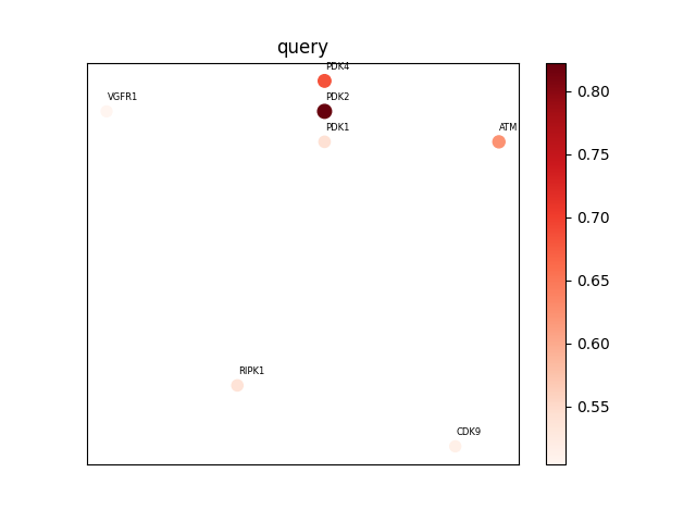 Kinase profiles of the submitted molecules predicted by the model. The more red points in the map suggest that compound potential selectivity may be poor. The fewer map points suggest that compound potential selectivity may be better.