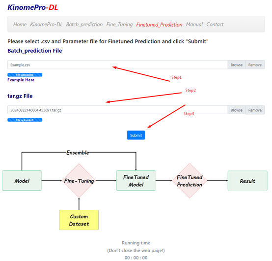 The procedure for making predictions using the fine-tuned model involves first uploading the molecules to be predicted (refer to Example for the required format), then uploading the compressed model parameter file (.tar.gz) downloaded after fine-tuning, and finally clicking the Submit button to initiate the prediction process.