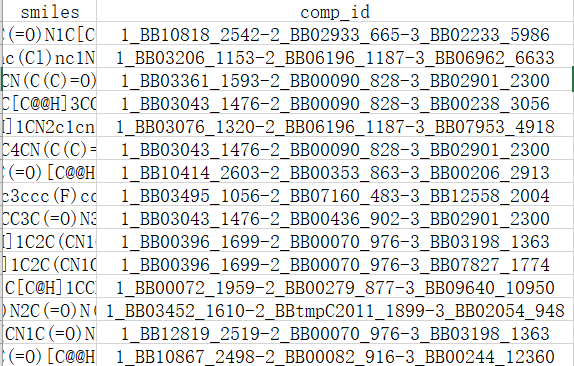 The first column is named 'smiles' and records the smiles information of the compounds, The second column is named 'comp _ id', recording the name information of the compound.