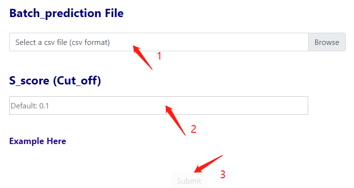 You can submit by uploading csv files containing batch molecules, then set the S_score threshold (Default: 0.1) and click on the submit button to submit the calculation.