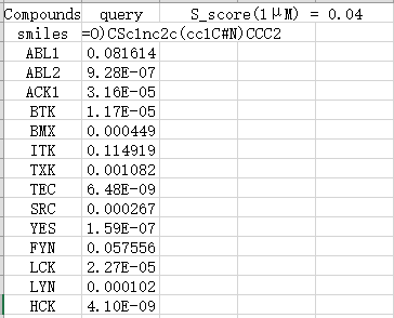 4.S_score: Value range (0-1), dividing the number of all targets predicted to be active by the total number of kinase profile targets (191), the greater the value, the worse the selectivity for the kinase profile, and vice versa.